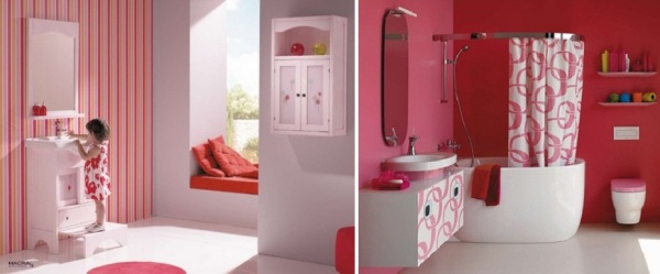 Атмосфера ванной комнаты для девочек также может быть наполнена образами из любимых сказок и мультфильмов. Также подойдут цветы, горошек, полоска и, конечно же, нежные «девичьи» сочетания цветов.
