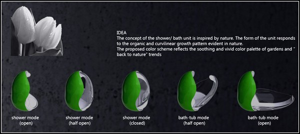 Ведь недаром Tulip Bathtub носит в своем названии слово «tulip», переводящееся как «тюльпан». Ванна эта, действительна, схожа с упомянутым цветком. Когда его «бутон» находится в закрытом состоянии, то Tulip Bathtub – это душевая кабинка. Когда же цветок раскроется, то кабинка эта превращается в полноценную ванну со стеклянными стенками.