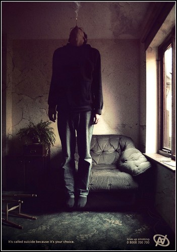 Создатели этого рекламного плаката показывают, что с каждой выкуренной сигаретой петля на шее курильщика затягивается все сильнее и сильнее.